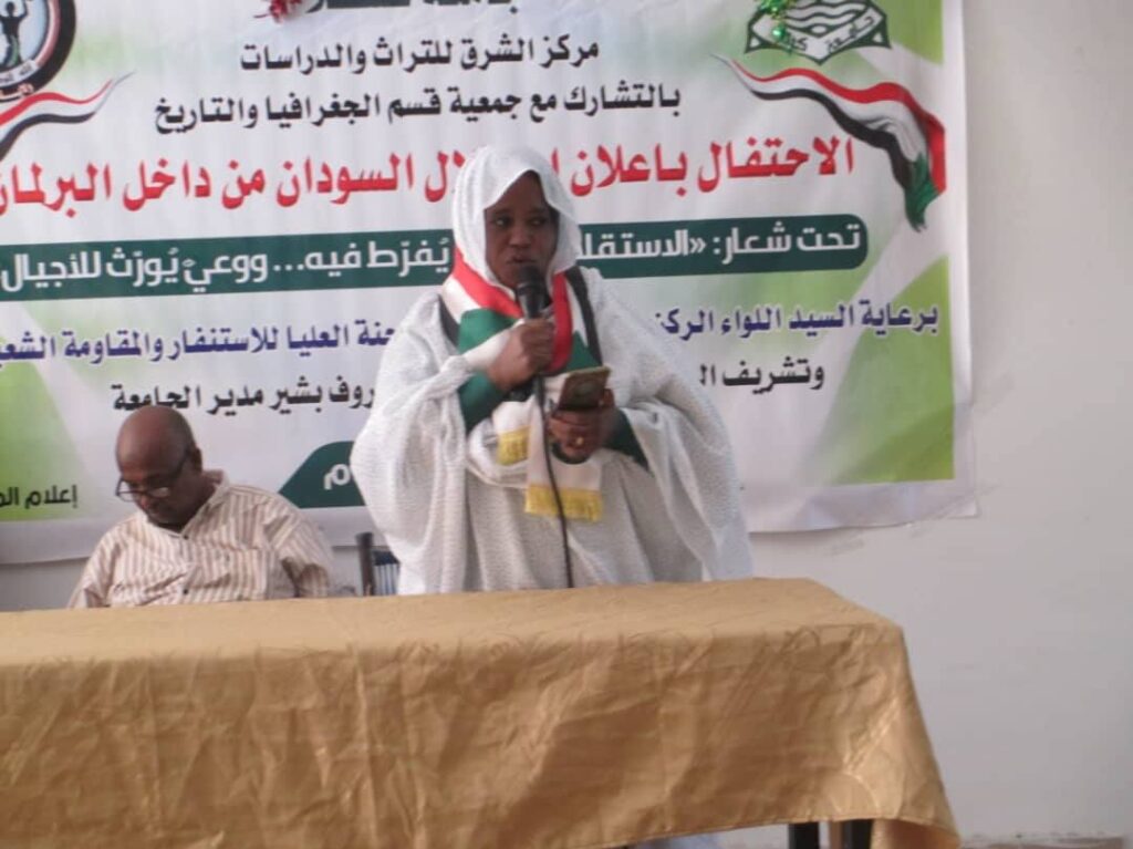 كما تخللت الاحتفال كلمات معبّرة، شملت كلمة جمعية قسم الجغرافيا والتاريخ ألقاها رئيس الجمعية الطالب إبراهيم أبوبكر، وكلمة مدير مركز الشرق للتراث والدراسات الدكتور نبيل رابح آدم، إلى جانب كلمة مديرة الجامعة البروفيسور آماني عبدالمعروف بشير التي أكدت فيها أهمية ترسيخ قيم الاستقلال في وجدان الأجيال وربط التاريخ بالوعي الوطني الحاضر والمستقبل.