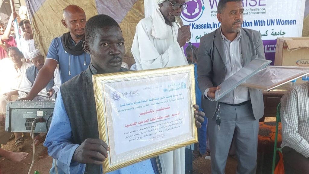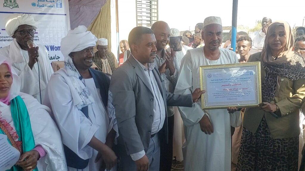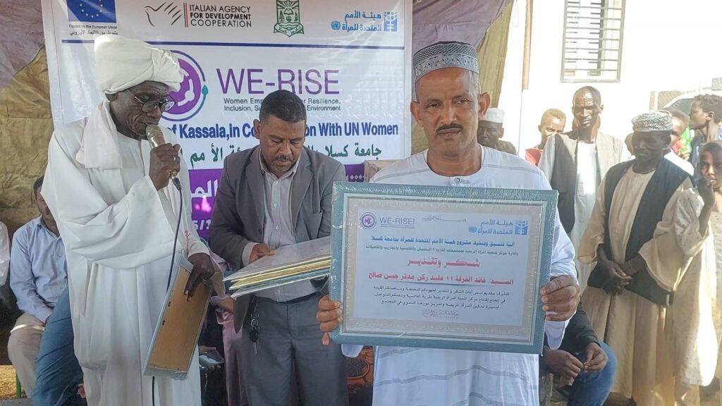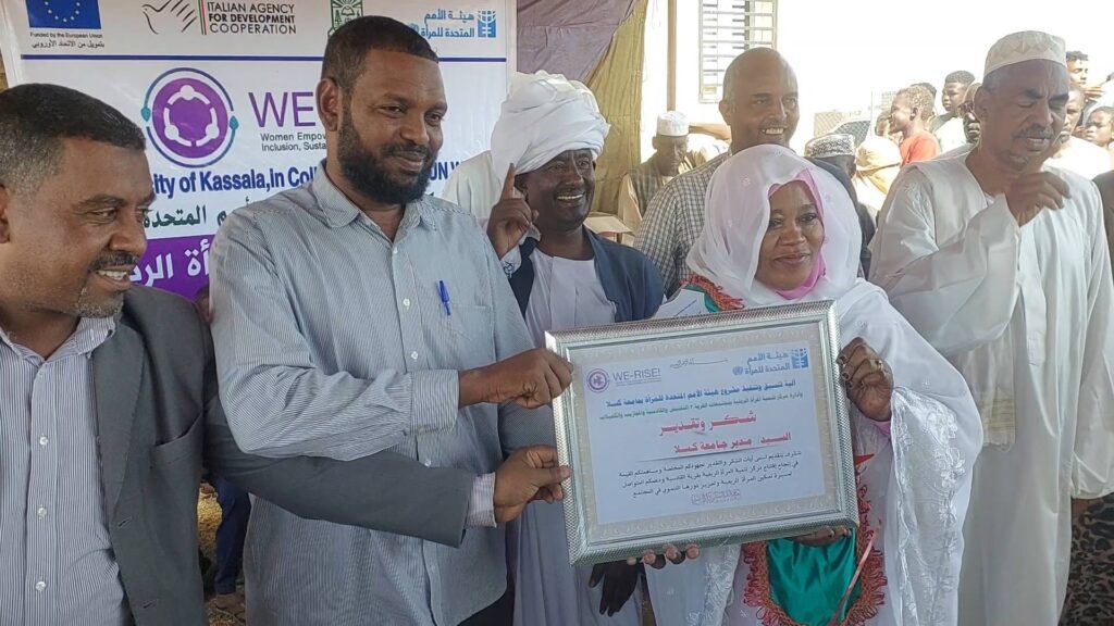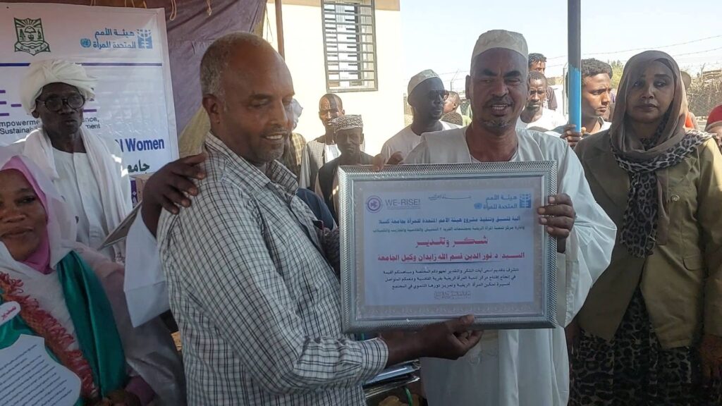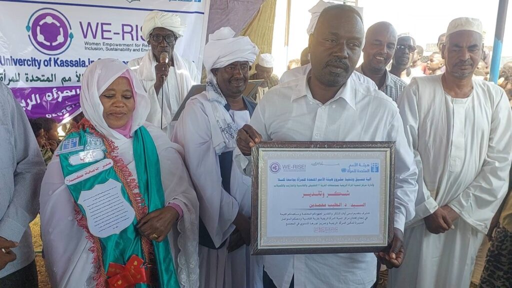مقرر الآلية التنسيقية للمشروع ، الدكتور عبدالله محمد خالد ، تقدم بالشكر الجزيل لكل الجهات الداعمة للمشروع ، وعلى رأسها هيئة الأمم المتحدة للمرأة، وإدارة جامعة كسلا ، وقيادات المنطقة ، مشيداً بالدور الكبير للمرأة الريفية في إنجاح المشروع منذ مراحله الأولى. وخص بالشكر القيادات المجتمعية : العمدة أوشيك أبو علي أوشيك ، الشيخ الطاهر ، لدورهما الفاعل في مساندة المشروع ودعمه حتى يرى النور . ومن خلال حديثه اكد بان هدف الآلية التنسيقية هو بناء قدرات المرأة الريفية لتكون شريكاً أصيلاً في التنمية المجتمعية المستدامة ، عبر التدريب ، والتأهيل ، والدعم الفني ، وتعزيز ثقافة الإنتاج والمبادرة ، بما يحقق الاستقرار الاجتماعي والنهوض بالمجتمعات الريفية .