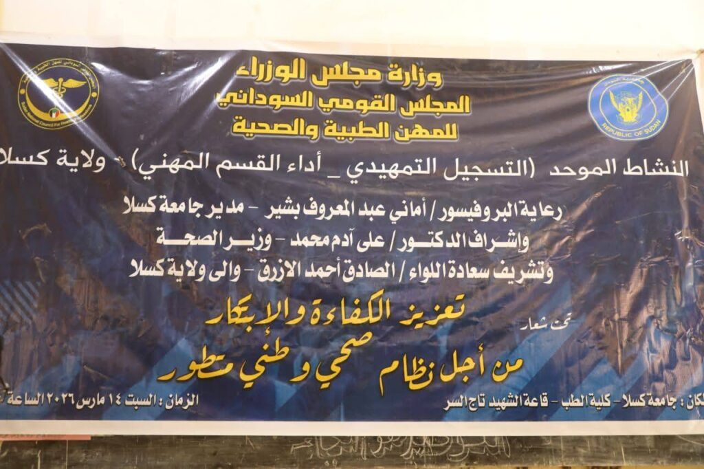 في يومٍ استثنائي يفيض فخراً وعطاءً ، سُطِّر في سجل الإنجازات الصحية بولاية كسلا ، شهد فرع المجلس القومي للمهن الطبية والصحية بالولاية مراسم التسجيل التمهيدي وأداء القسم لعدد (310) ممارس وممارسة من مختلف التخصصات الطبية وخريجي الجامعات السودانية ، في لوحةٍ مهيبة تعكس عظمة الرسالة وشرف المهنة.