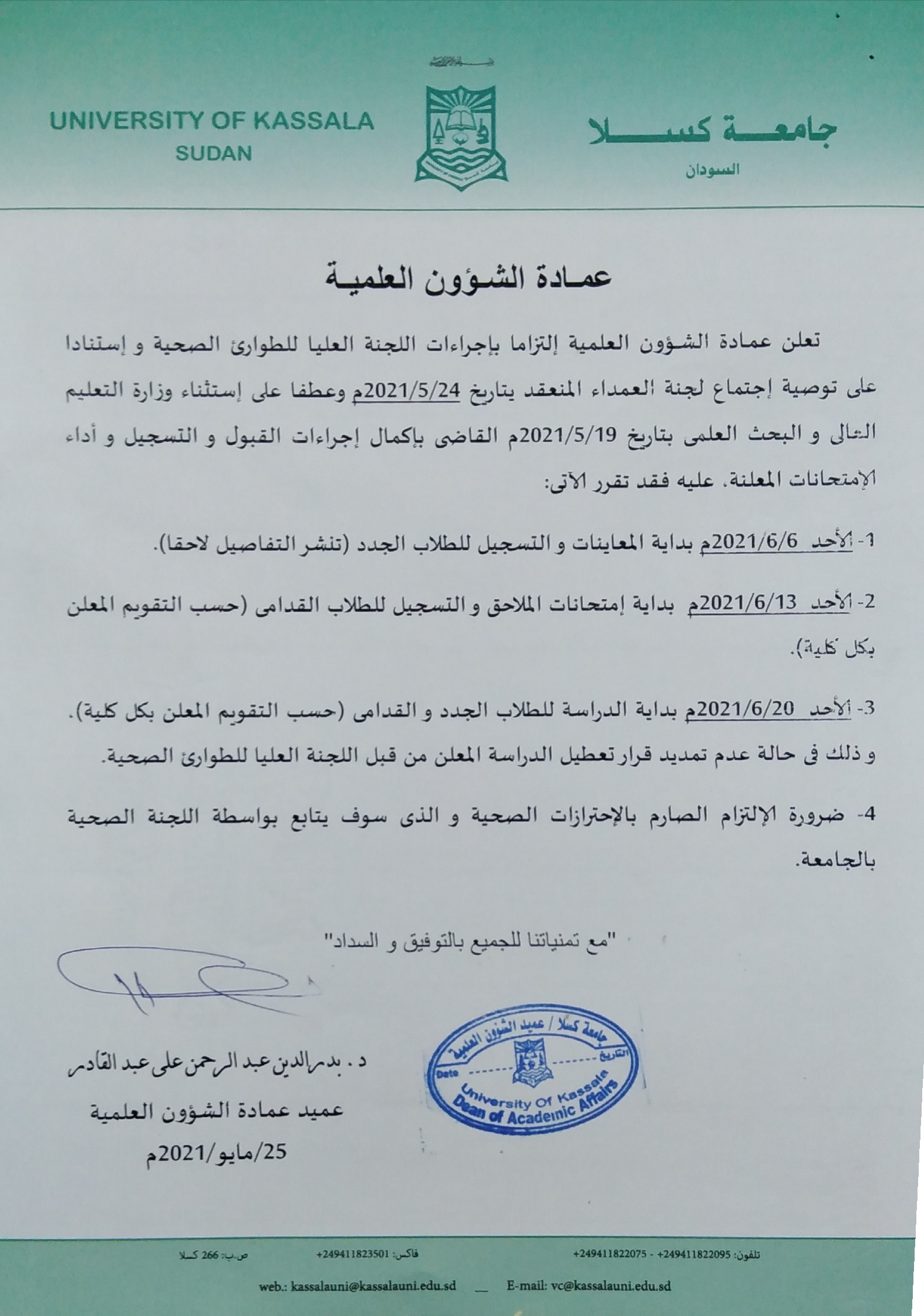 في إطار سعي كلية الدراسات العليا الحثيث لتطبيق الاحترازات الصحية و الاستفادة من التقنيات الحديثة في إنجاز مهامها تم بحمد الله و توفيقه اليوم الاربعاء 30-12-2020 عقد لجنة مناقشة طالب ماجستير الإحصاء بكلية الدراسات العليا-جامعة كسلا سامي حمزة صالح اسفيريا و تكونت لجنة المناقشة مند. خالد رحمة الله – جامعة Read more…